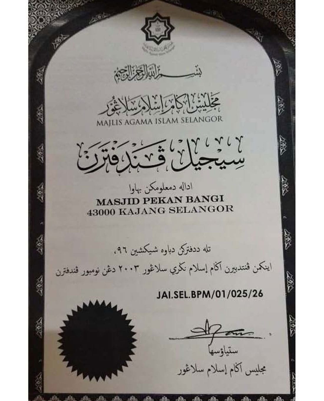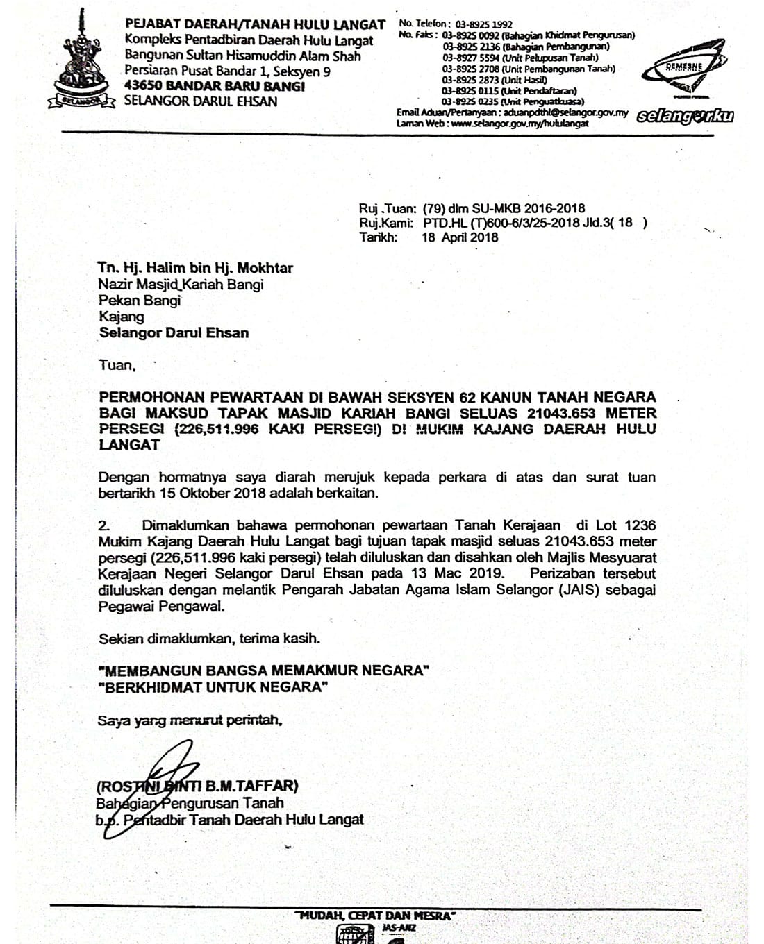 SURAT KELULUSAN PEMBINAAN MASJID KARIAH PEKAN BANGI